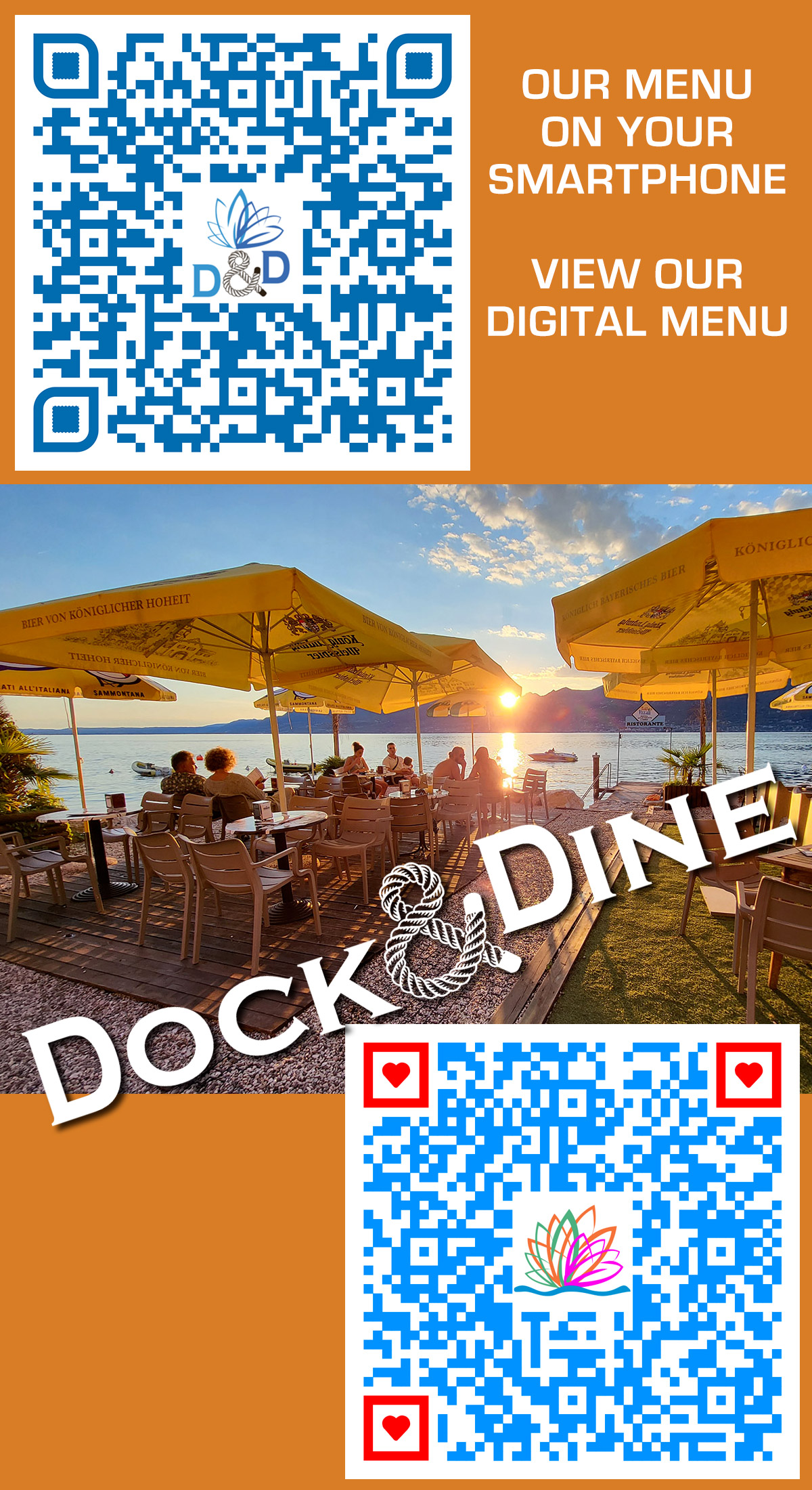 Dopo una giornata passata a nuotare, prendere il sole, fare kitesurf, in barca a vela o in motoscafo, jet ski e mountain bike nel favoloso entroterra del Monte Baldo, rilassatevi nel nostro bar e ristorante sulla spiaggia fronte lago "Dock-and-Dine". Situato a sud di Castelletto di Brenzone, direttamente presso la spiaggia privata dell'Hotel Taki e direttamente collegato al nuovo lungolago, il locale è facile da trovare perché si trova proprio accanto alla scuola di kite e windsurf riconoscita VDWS Beekite.